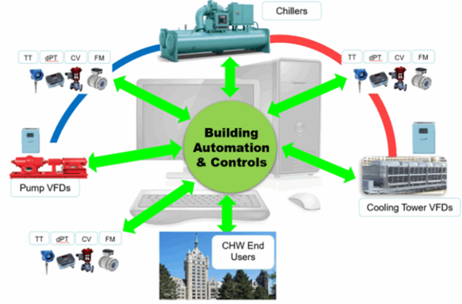 - Automatic Central Plant Controls: New building automation system (BAS) incorporates fully automatic functioning of chillers and associated accessories. When the demand for cooling changes, permissive are displayed on the screen to either start or stop a chiller. Based on the operating executive’s preference for the next chiller to be turned on or off, associated chilled and condenser water pumps, cooling towers are automatically turned on or off.